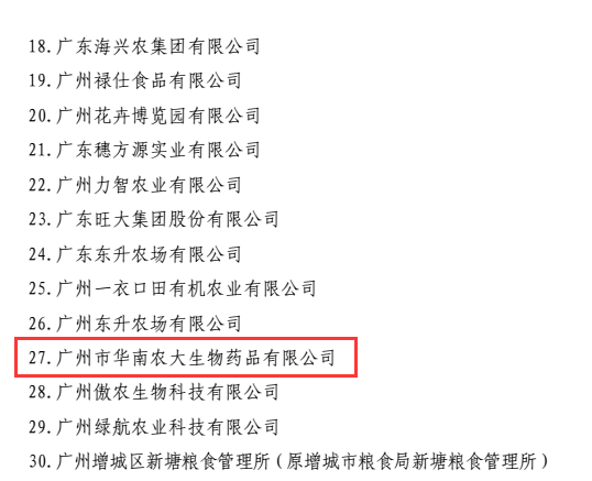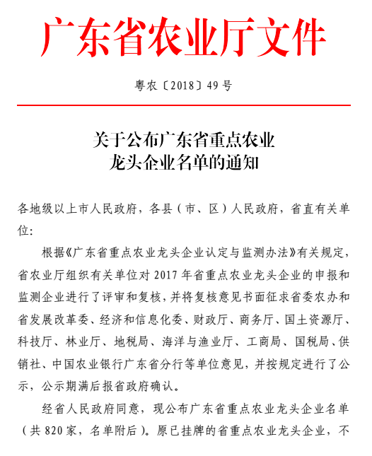 熱烈祝賀華南生物被認定為“廣東省重點農業龍頭企業”