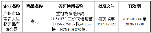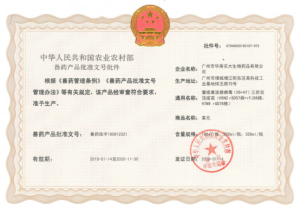 2019年1月14日,由華南農業大學、中國獸醫藥品監察所、廣州市華南農大生物藥品有限公司(以下簡稱“華南生物”)共同研制的重組禽流感病毒(H5+H7)三價滅活疫苗(H5N2 rSD57株+rFJ56株,H7N9 rGD76株)通過農業部獸藥產品批準文號的審批,喜獲得農業部核發的獸藥產品批準文號——獸藥生字190912321;商品名:禽元。