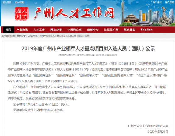 2019年度廣州市產業領軍人才重點項目擬入選人員(團隊)公示鏈接: