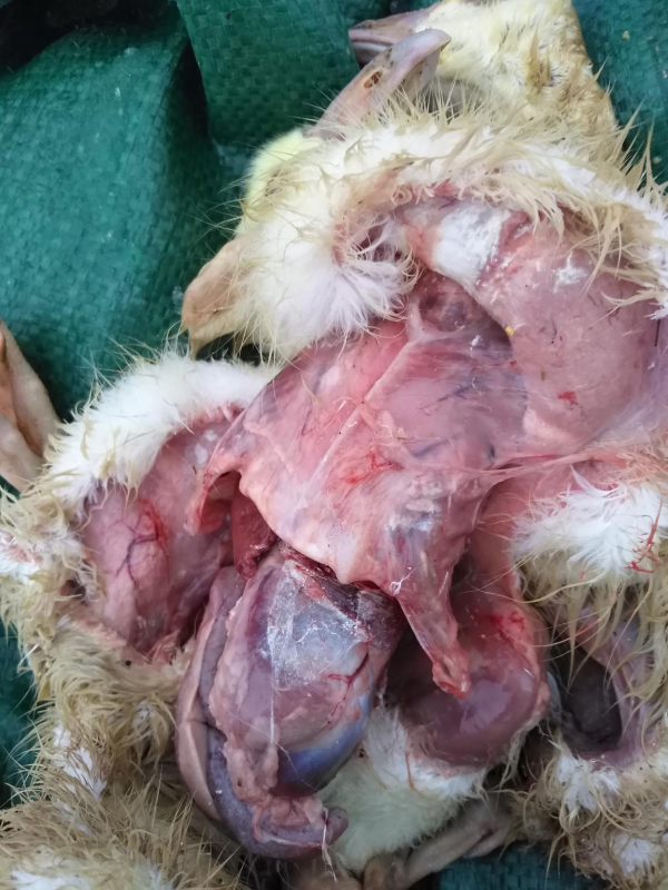 3、發病后期:表現站立不穩,喜臥,受驚嚇時也不能行走,雙側附關節明顯紅腫,喙發紅,體溫升高,脫水。附關節手感發燙,觸碰時雛鵝有疼痛感。大群拉水樣稀便。