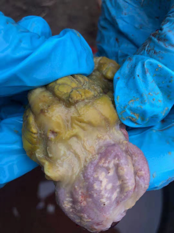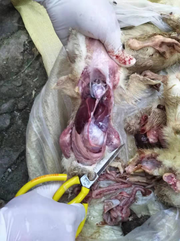 剖檢可見全身皮下清晰可見尿酸鹽沉積,附關節紅腫且關節腔內有尿酸鹽沉積,腎臟腫大,呈花斑狀,表面有尿酸鹽沉積,輸尿管高度擴張,管腔內充滿石灰樣沉積物,其他內臟器官(心、肝、脾、腸系膜、腹膜)的表面有白色尿酸鹽沉積,嚴重時形成一層白色的薄膜,肌胃角質層易剝離,顏色發黑并伴有潰瘍,腺胃腫脹,表面有白色物質附著。少量有大腸桿菌及漿膜炎等細菌感染的病理變化。