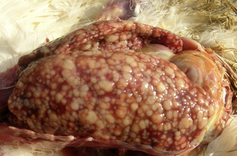 3、禽傷寒:肝臟變成淡綠棕色或古銅綠色,肝臟表面有時有灰白色米粒狀壞死點。