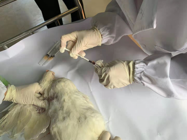 初學(xué)者往往找不到最好的下針位置,容易扎偏。建議采集者壓住皮膚不讓血管滑動(dòng),找準(zhǔn)部位下針,或者不從血管正上方下針而是讓針尖與血管走向呈一定的角度入針。入針后針頭的走向如果確定不好也不用著急,一旦回血可以暫且不繼續(xù)入針,而是保持姿勢直接抽取。抽血時(shí)若遇到血流抽取速度緩慢,不能心急,可以稍微旋轉(zhuǎn)針頭或極輕微地往外拔一下針頭。另外,最大采血量不超過雞體重的1%。