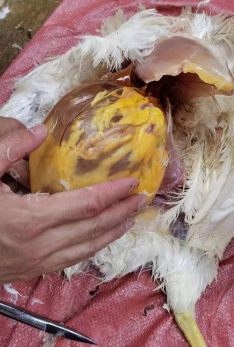 茂名某規模化蛋雞場飼養蛋雞3棟,單棟1.5萬只。A棟雞從開產到230日齡產蛋率一直上不去,維持在85%左右。大群采食量和飲水正常,平均每只雞采食量為105g,大群精神狀況良好,糞便正常。臨床觀察發現個別雞只(30只左右)腹部膨大下垂,觸之有波動感。頭頸高舉,行走時呈企鵝狀姿勢。B棟和C棟無此情況。