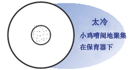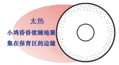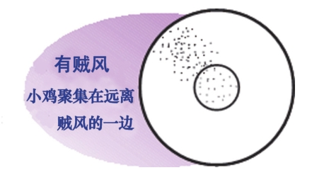 (3)雞舍內(nèi)的溫度要保持均衡和穩(wěn)定,避免溫度忽高忽低和雞舍兩端溫差過(guò)大,檢查溫度是否合適的最佳方法,是觀察雞苗的分布狀態(tài)及活動(dòng)表現(xiàn)(如下圖,中間小圓圈為加熱器)。